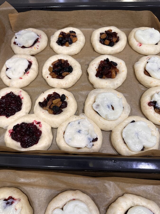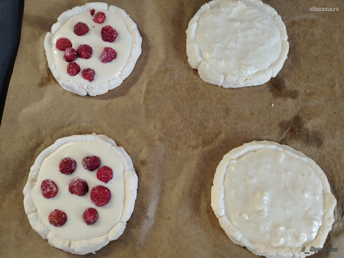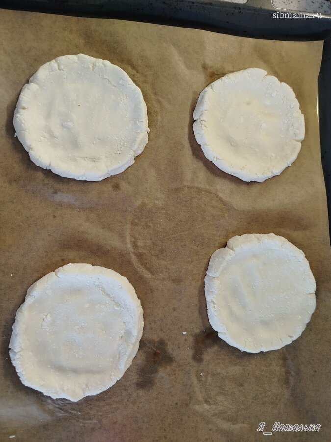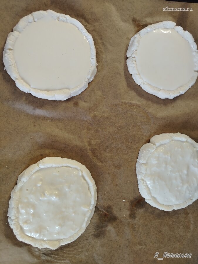 Взвесить тесто и разделить на равные части, у меня получилось 320гр, 4 основы по 80гр, сформировать основу для ватрушек