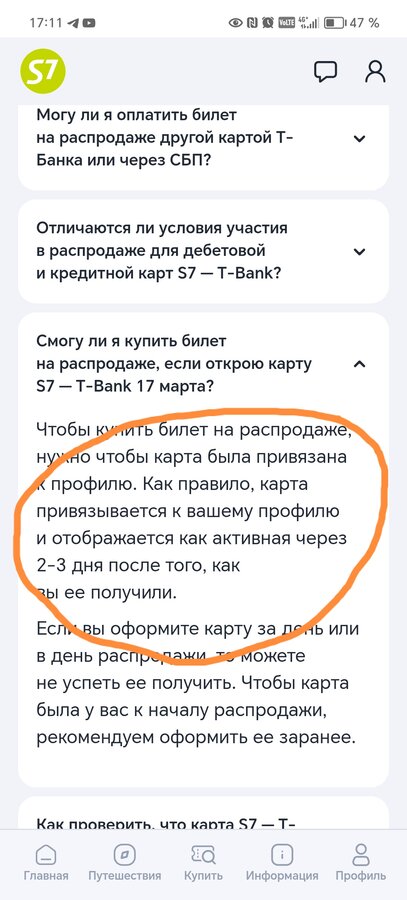 Скажите, пожалуйста, в течение какого времени карта s7-T-банк привязывается к профилю s7?