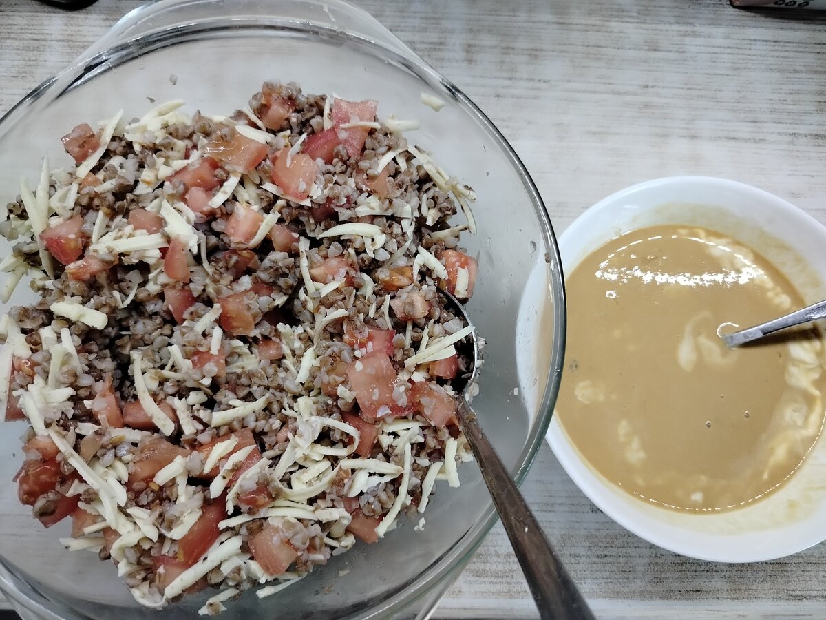 Около стакана отварной гречки осталось со вчерашнего дня, порезала 2 помидорки без кожуры, остатки твердого сыра (около 60г) натерла на терке, смешала. Заливку взяла оригинальную: 1 яйцо+сметана 1 ст.л.+соевый соус и немного мускатного ореха.