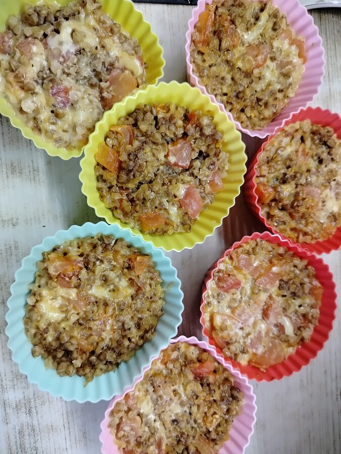 Гречку выложить в формочки для кексиков, полить заливкой. И в микроволновку (так как у меня максимум около 700, то пришлось крутить 2 раза по 4 минуты, при большей мощности может быстрее запечься).Я многовато положила сметаны (почти 2 ложки получилось ), надо было добавить еще яйцо, так как запеканки получились рыхлые. Но вкусные.