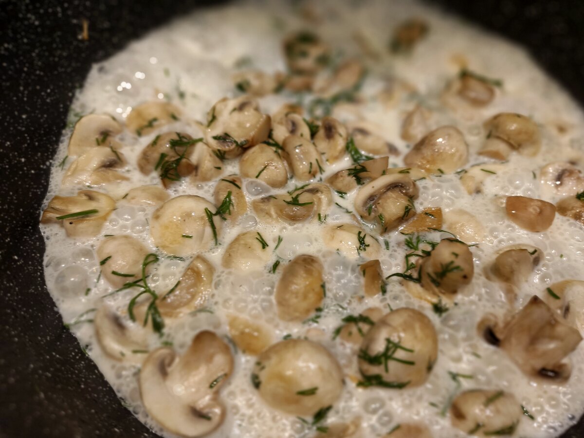 Грибы жарим и солим. Обязательно в сами грибы добавить сливочки чуть чуть и зелень. Нет сливок, я лью несколько ложек жирного молока и выпариваю.