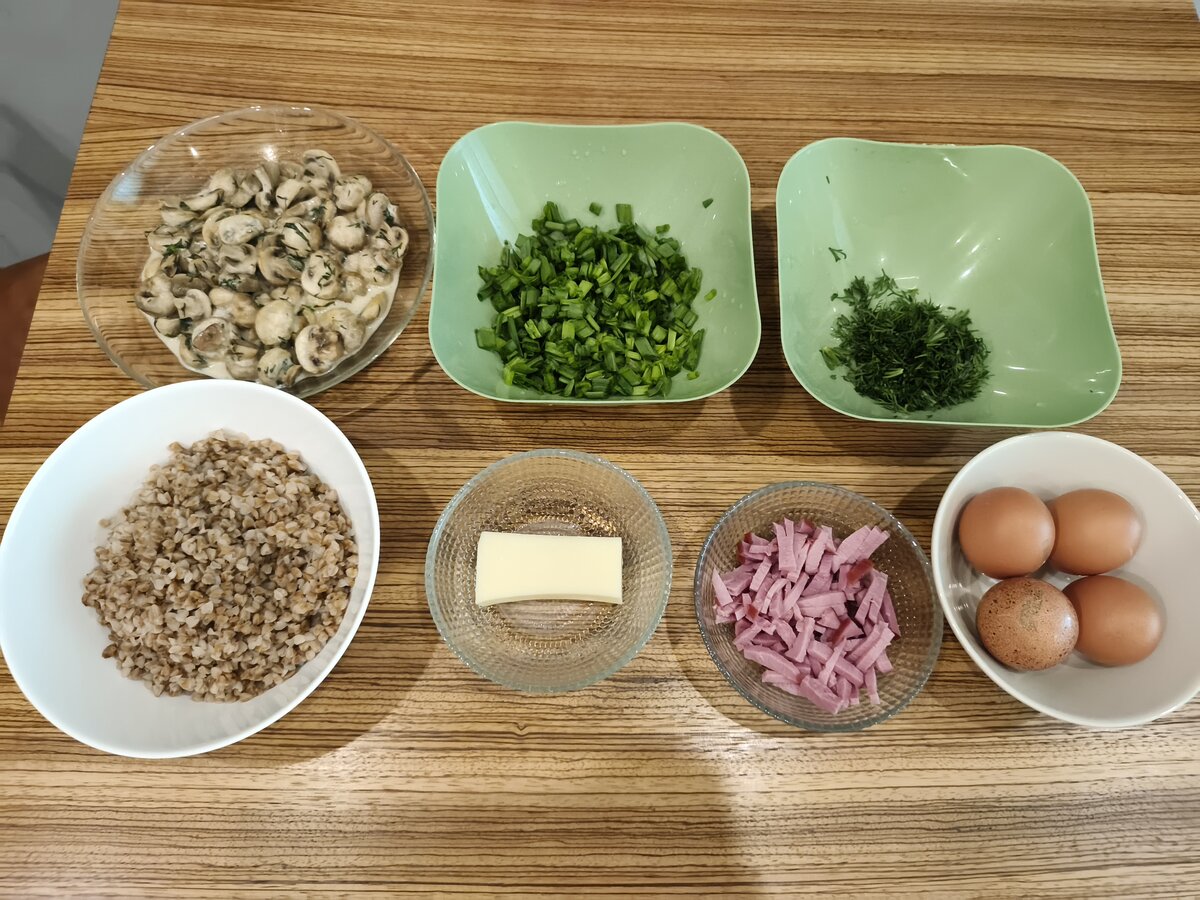 На самом деле основа гречка, зелень и яйца + к этому вы можете уже добавлять любое мясо и любые любимые овощи, можно по-отдельности, можно вместе.