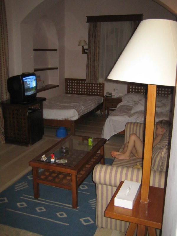 Номер. О! Номер нам достался такой шикарный, единственный недостаток – удален от моря в 7 минут ходьбы, но в принципе неудобств не доставляло. Сначала мы хотели поменять на виллу, но сравнив два номера и увидев, что вилла меньше, а идти на самом деле всего на 1,5 минуты ближе, решили остаться в своем. Номер 2-х комнатный, состоял из большого зала, небольшой «кухоньки» с барной стойкой и холодильником с морозилкой, коридора со шкафом, большой ванной с душевой и немаленькой спальней с двумя большими кроватями и детской кроваткой, принесенной нам вечером по приезду. У нас была своя терраса со столиками и стульями и небольшая лужайка перед домом (сын успел по ней побегать вечером босиком ). Телевизор ловил в основном РТР Планету и иногда ОРТ, у отеля есть свой канал, где они транслируют инфо о развлечениях и услугах. Сейфа нет – можно на ресепшене, мы обходились своими сумками с замками. Все в хорошем состоянии, один раз были проблемы с сантехникой, но все починили в течение нескольких часов. Уборка номера – хорошая, за 2-3 фунта и конфетку Новосибирских нам выкладывали таких лебедей и цветы – супер. На последок, когда мы оставили ему миниатюрную бутылочку Немирова, он нас поприветствовал утром по-русски, хотя до этого только Hello .