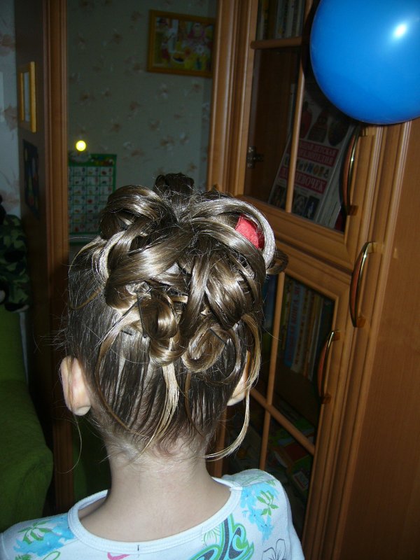 А это я пробовала накрутить "взрослую" причёску. Смотрелась она хорошо, и продержалась весь вечер, не развалилась - без лака,конечно, здесь не обошлось.