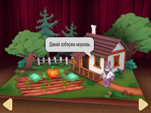 Недавно проводили фокус-тест в Томске. Мы показали сказку нескольким малышам, и заметили один печальный момент. Ребенок часто задевает ладошкой стрелочки для перехода на другую сцену. В большинстве случаев это происходит случайно, когда ребенок пытается нажать на дерево, или к примеру, морковку. Иногда они нажимают на эту стрелку потому, что это первое что им бросается в глаза.