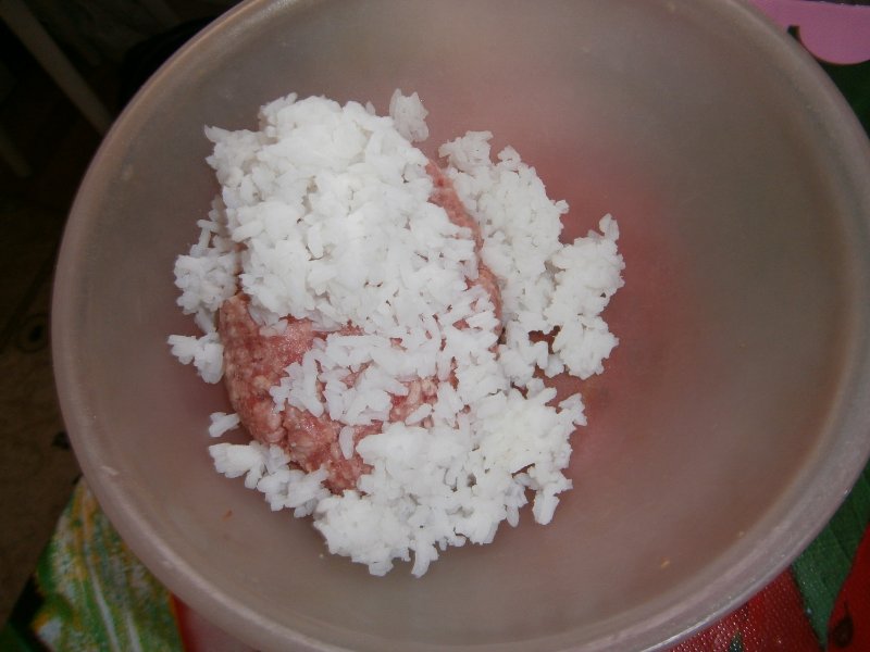 фарш: говядина+свинина, лук мелко, рис, морковь на мелкой терке, соль, перец