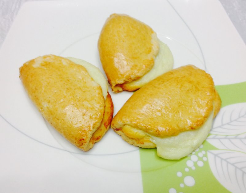 Тесто раскатать, вырезать кружки, с одного края положить творог и накрыть второй половиной кружка, не придавливать.