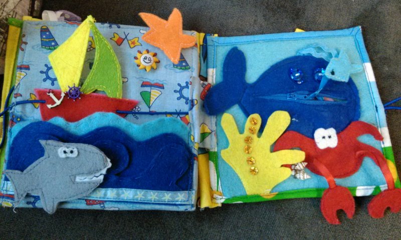 у всех насмотрелась их твоерний. и тоже захотелось похвастаться. вот эту книжку для доченьки я начала шить когда была на 7 месяце беременности и закончила когда дочке было 7 месяцев, сейчас нам уже почти 2 года, а до сих пор играем в нее)))