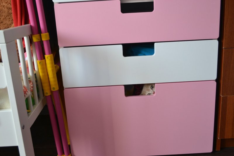 Ах, какая жалость, что всего 1 фотография! Столько раз мои чудики удивляли своми способностями забраться то туда, то сюда. То в стиральной машинке закрутится, то умудрятся под коврик забраться, то в ведро занырнуть. Да и случайно подсметренные кадры есть. Ну раз одна, то вышлю, пожалуй эту:
