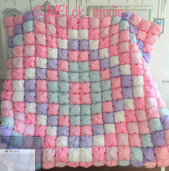 Девочки сейчас не нужно отдельно каждый квадратик отдельно сшивать)) можно сделать стежку на ткани с защипами. а с обратной стороны пришивается марля. В ней делаются дырочки и туда пихаем синтепух или холофайбер! Это одеялко или подушки называются Бомбон  |