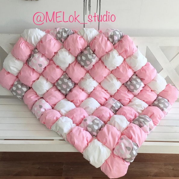 Все проще, скалывается каждый квадрат ткани (защип), потом по рисунку рядами собирается, квадрат + флизелин (это низ), ряд по горизонтали или по вертикали, без разницы. Затем складывается полученное, слой синтепона и хлопковая ткань и сшивается, оставляем небольшое отверстие чтобы вывернуть, зашиваем его вручную потайным стежком. Да.. это называется бомбон одеяло или бомбон бортики
