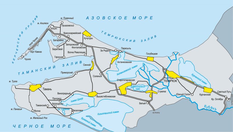 скинула карту, на ней очень хорошо видно все побережье. и где какой населенный пункт находится. Сенной весь расположен вдоль Таманского залива,
