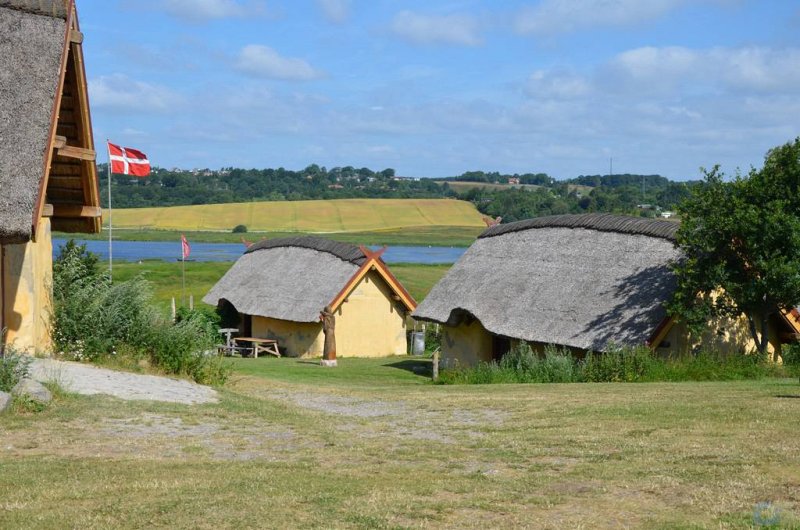 Деревня викингов неподалеку от Хобро (восстановленная ). Можно просто походить, а можно примерить на себя костюмы викингов и их жен, испечь лепешку на открытом огне, выковать что-нибудь в кузнице