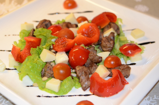 Берем тарелку, выкладываем листья салата, затем кубики сыра, горячую готовую печенку, горячий перец, кедровые орешки и поливаем бальзамическим уксусом.
