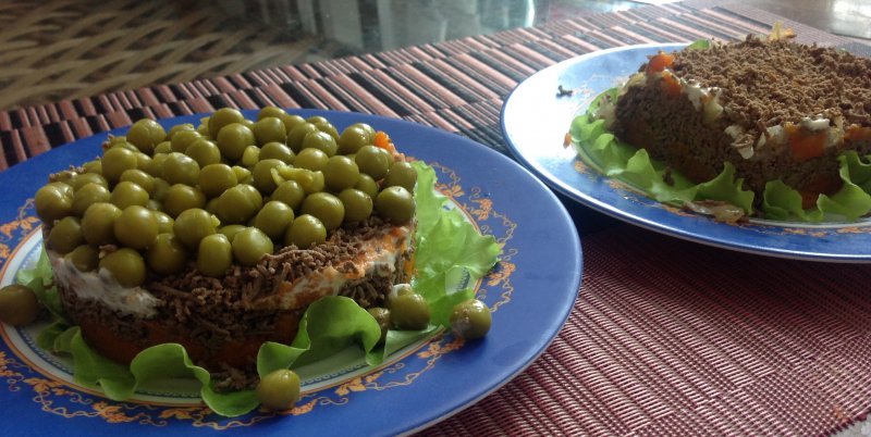 Укладывала слоями:мужу с майонезом,себе без лука со сметанкой и горошком.
