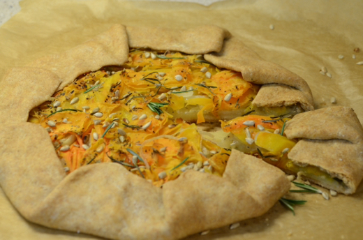 Тесто раскатать на листе пергамента. Выкладываем начинку, отступив от края. Сначало выкладываем картофель, солим, затем лук и тыкву. Еще раз посолить. Сбрызнуть растительным маслом, посыпать травками. Я сегодня еще добавила свежий розмарин.