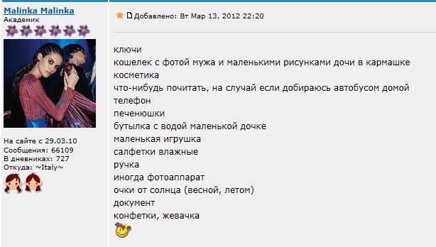 паспорт, карточки пластиковые, зеркальце, жвачки, расческа, заколка, салфетки влажные, платочки одноразовые, одноразовые штуки для унитаза, прокладки, антисептик для рук, самогревы для ног, телефон, деньги без кошелька (он много места занимает), косметичка: таблетки от головы, горла, увл.глазные капли, крем для рук, салфетки от жирной кожи, помада, карандаш для губ, миниверсия крема для лица, тон.крем в виде помады, мал.туалетная вода. От ситуации +\- тетрадки, ежедневник, зонт, термос. Один раз наводила в сумке порядок, нашла трусы )) муж был в шоке )) сама сначала удивилась, но потом вспомнила, что я их брала с собой когда к сестре с ночевой ездила, а че такого :haha: теперь когда уду куда то, всегда говорит: "Трусы чистые не забудь, а то мне перед Иваном Иванычем стыдно будет" :haha: