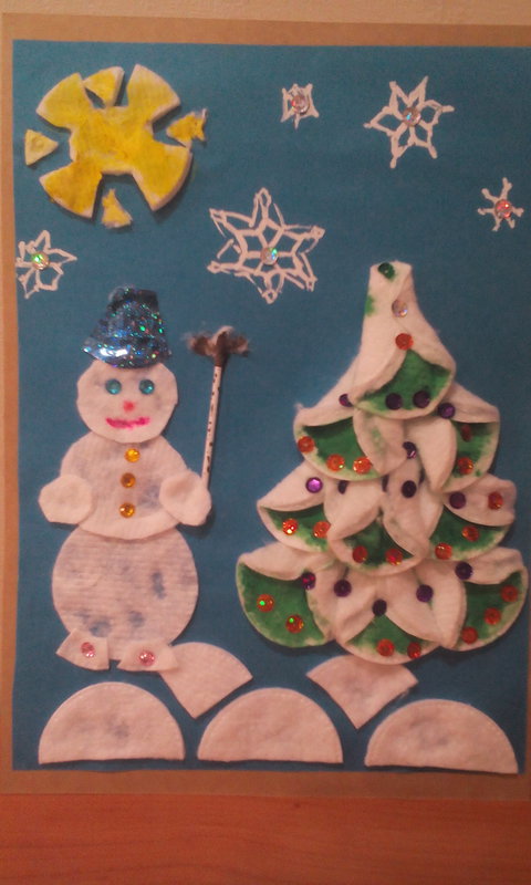 делали из ватных дисков, раскрашенные гуашью, клей ПВА, пайетки и стразики, а снежинки нарисованы корректором :haha: , идея взята из инета ;)