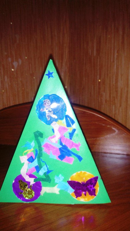 Придумала идею и выбирала из журналов чем и как будет украшать ёлочку дочка сама, я помогала вырезать мелкие детали.
