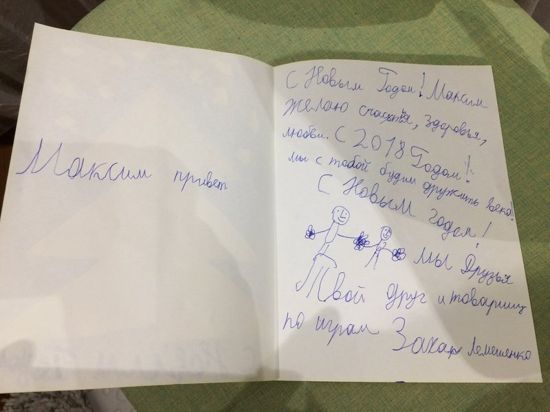 Сын очень серьезно относится к дружбе. Его лучший друг спортсмен и Захар так разволновался, что вдруг он уедет на тренеровки и пропустит приход деда Мороза, что решил сделать ему открытку на случай если это произойдет, то открытка его утешит. :-)