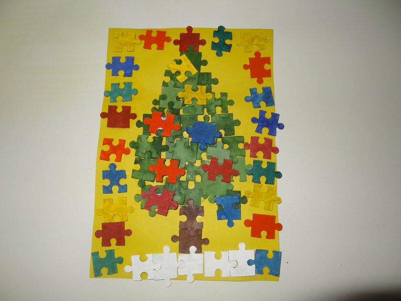 моя старшая дочка ( 4 года) очень любит собирать пазлы, поэтому новогоднюю открытку для Деда Мороза выполнила из окрашенных пазлов. Делала всё сама, я только подкинула идею ;)