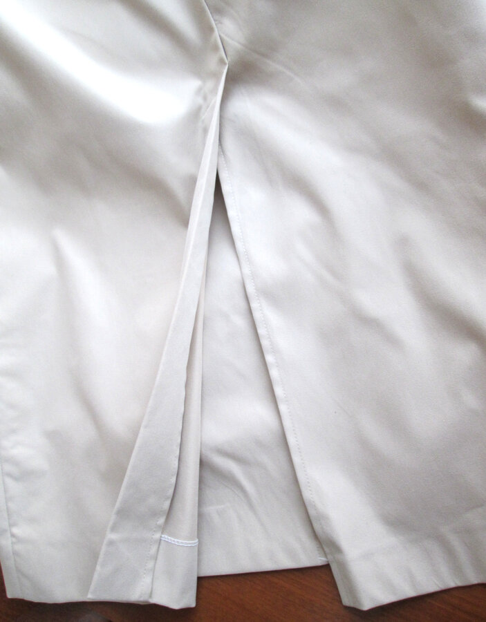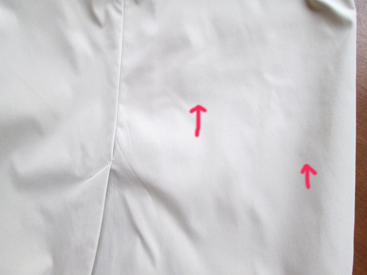 Сзади, чуть выше разреза 2 полоски ручкой, так и продавался, в магазине не заметили. На человеке абсолютно не видно, если с лупой не разглядывать (см. последнее фото).