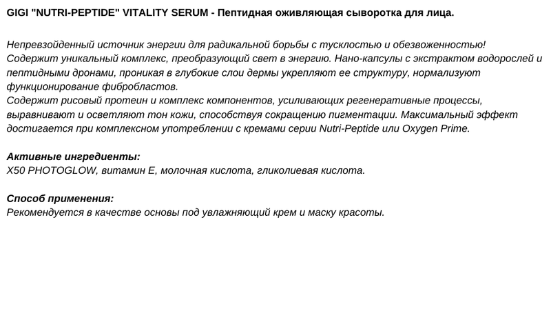 Уникальный на российском рынке продукт – бустер останавливающий естественный процесс старения и поворачивающий время вспять! Моментально улучшает не только структуру кожи, но и поддерживает свежий, сияющий вид. Наличие в составе гиалуроновой кислоты различной молекулярной массы способствует моментальному, глубокому увлажнению всех слоёв дермы. Пептидный комплекс воздействуя на фибробласты и стимулируя коллаген, эластин способствует укреплению контуров лица, улучшает текстуру и сглаживает дефекты кожи, предотвращает появление морщин, разглаживает существующие.
