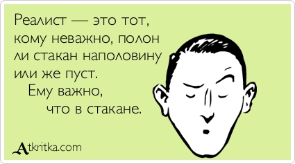 С чего вы взяли, что я категорически настроена против оптимистов? Меня как раз знакомые оптимистом считают, я писала уже про это. А беспробудные оптимисты, у которых по любому поводу «все к лучшему»... ну не то, что тупые, скорее, эгоцентричные и инфантильные. И да, с очень низкой планкой притязаний. Может, это и неплохо в контексте дзена, кто знает?  _________________ «Я твердо верю в удачу. И я заметил, что чем больше я работаю, тем больше она мне улыбается.»