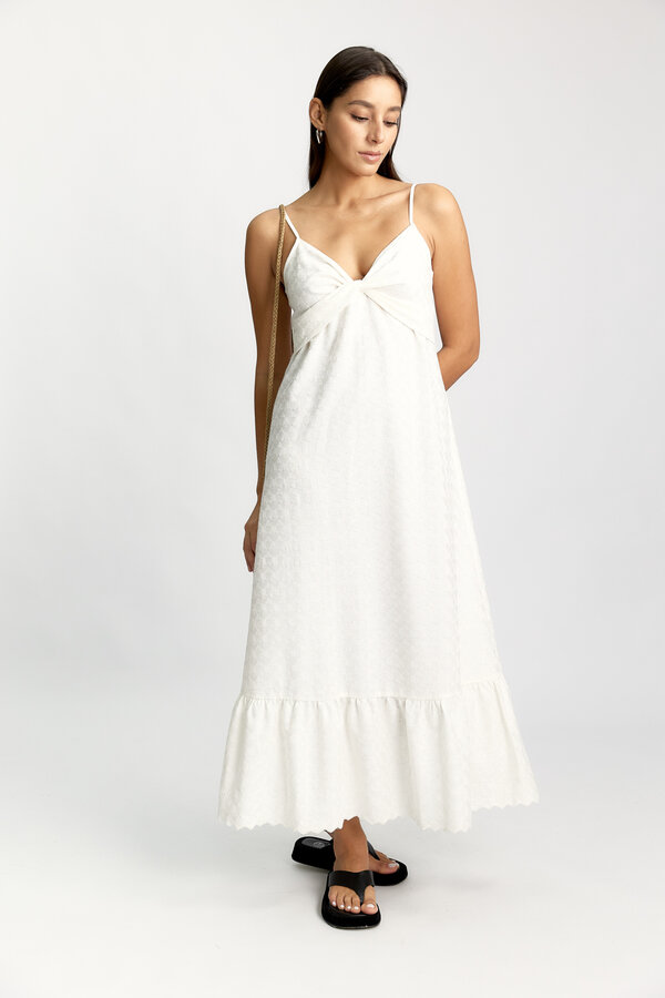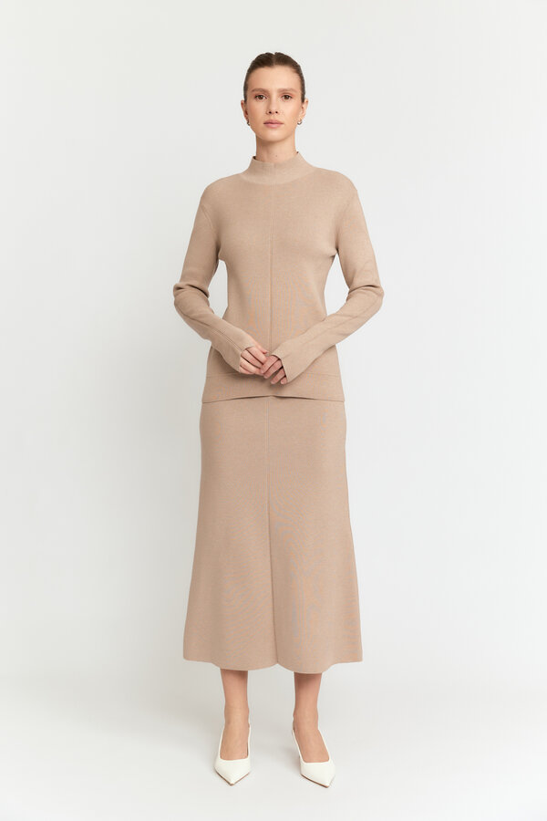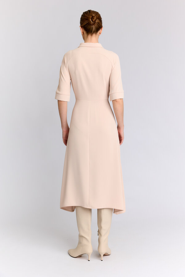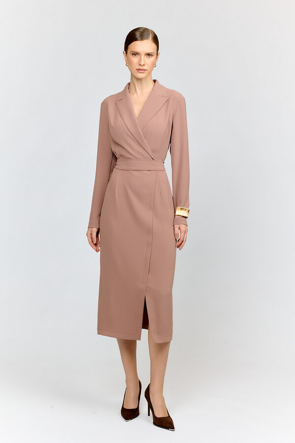 32 Платье прилегающего силуэта длиной миди с декоративным перекрутом по центру. Плательный матовый креп цвета капучино (100% полиэстер) 4900