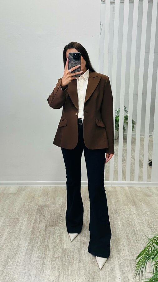 33 Брюки прямого силуэта со стандартной посадкой. Костюмная ткань коричневого цвета (77% терилен, 18% район, 5% спандекс) 3400