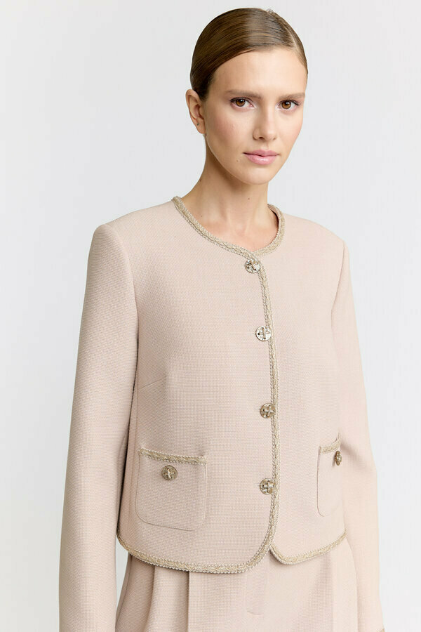 Двубортный жакет без подклада с лампасом по плечевому шву и рукаву. Воротник английский, низ рукава оформлен манжетой. TREND Вискоза креш костюмная с меланжевым эффектом натурального бежевого оттенка (75% район, 25% лен) 2870р