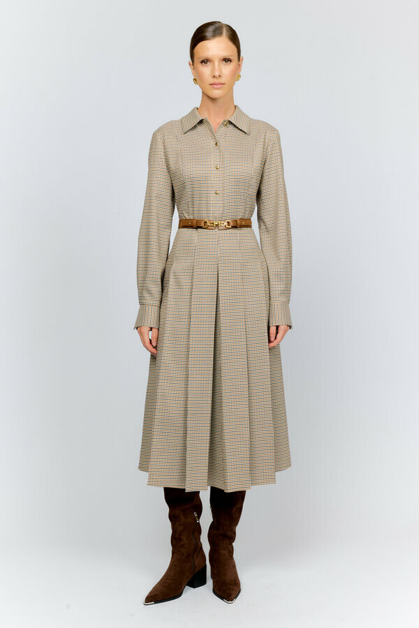 3 Платье приталенного силуэта с отложным воротником и застежкой на пуговицы спереди из костюмной ткани с содержанием вискозы в клетку на молочном фоне с крупными складками по юбке. Костюмка в бежево-черную клетку на молочном фоне (82% п/э ,16% вискоза, 2% спандекс) 5400