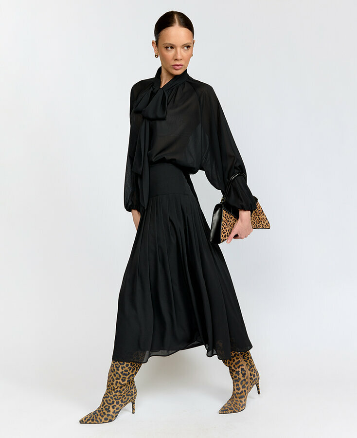 24 Воздушное платье с цельнокроеным рукавом, отрезное по линии тали (на резинке). Юбка расклешенная до колен с широкой обтачкой по низу. Рукав 3/4 PREMIUM QUALITY/TREND Блузочный виcкозный лен с фактурой под шелк с прозрачным эффектом черного цвета (60% район, 40% лен) 2900