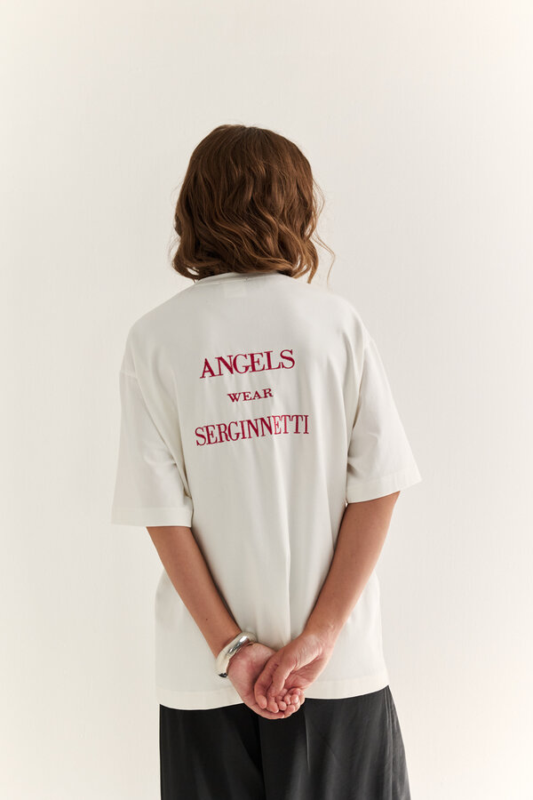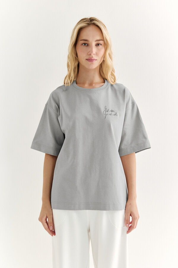 9 Футболка прямого силуэта с принтом по полочке Хлопковое трикотажное полотно кулирная гладь молочного цвета. Принт Mindful (осознанный) (95% хлопок, 5% лайкра) 1950