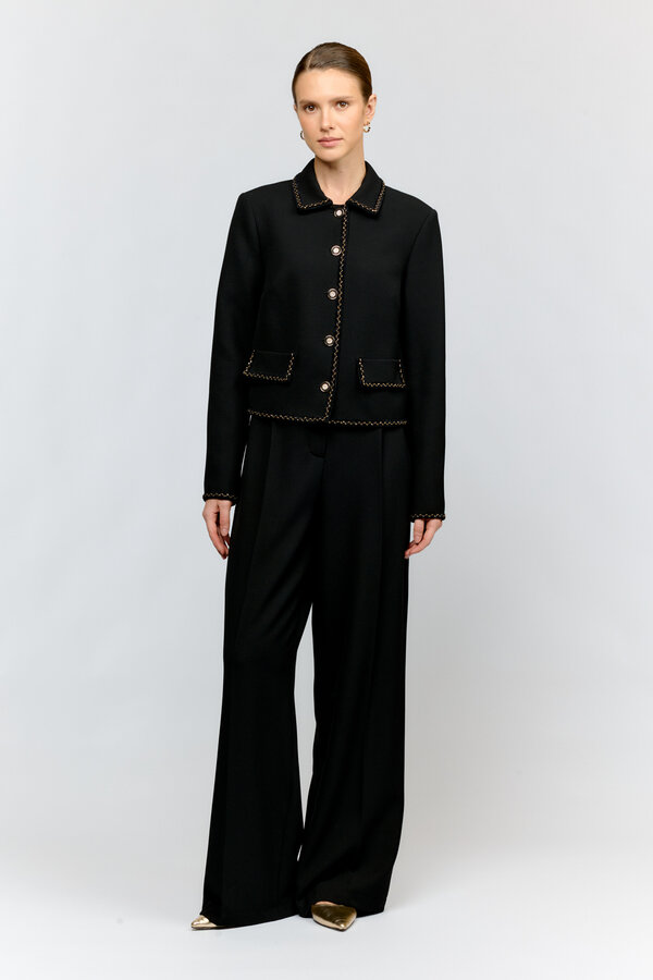 Жакет прямого силуэта длиной до бедер с английским воротником. Приталивается завязывающимся поясом. Лацкан декорирован тамбурной строчкой. Гладкокрашеное трикотажное полотно черного цвета (68% вискоза, 28% полиамид, 4% эластан) Италия 42 размер 2500 рублей