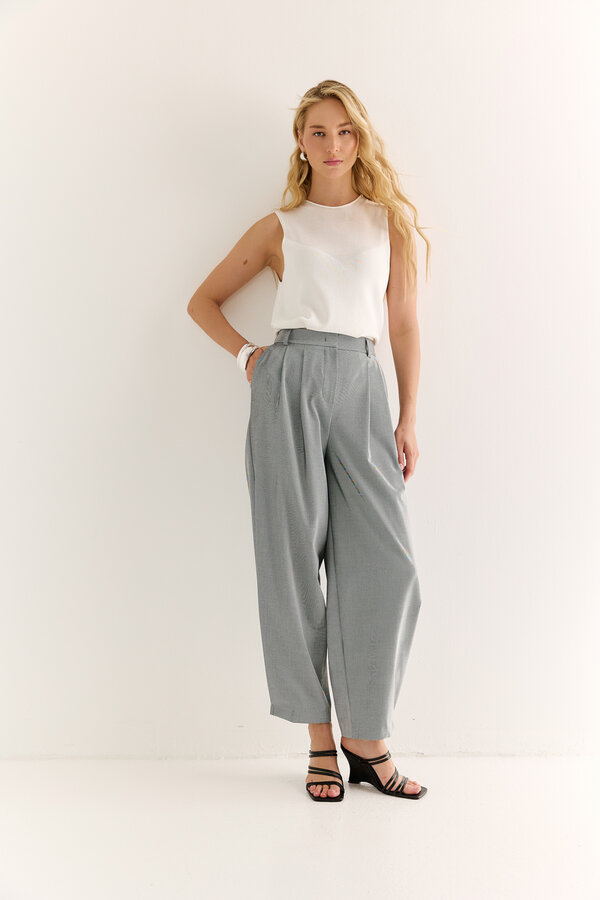 3 Брюки прямого силуэта с небольшим клешем в мужском стиле с посадкой на талии. NEW Костюмная ткань в черно-белую крупную клетку с люрексом (65% п.э., 31% вискоза ,2% спандекс, 2% люрекс) 2100 1000