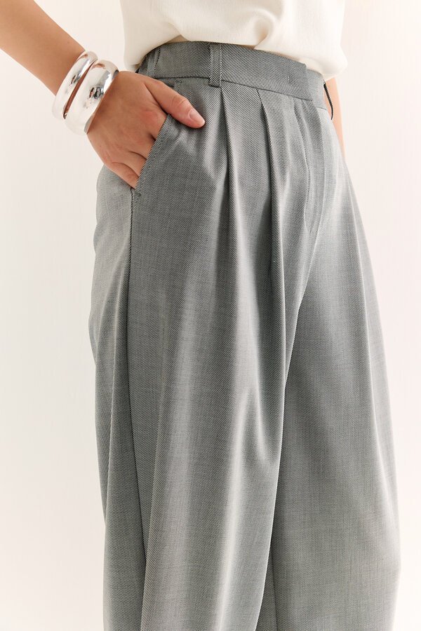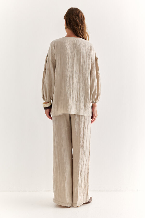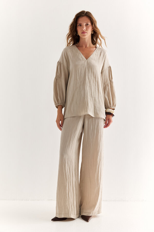 15 Брюки с завышенной линией талии, выточка оформлена складкой, на поясе, имеются карманы в ковом шве. Силуэт брюк бананы, длина до щиколотки. TREND PREMIUM QUALITY Легкая костюмная техноткань бежевого цвета с крэш эффектом (59% район, 35% п.э., 6% нейлон) 1800 500