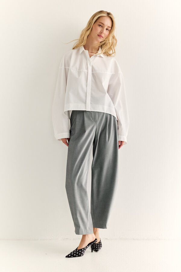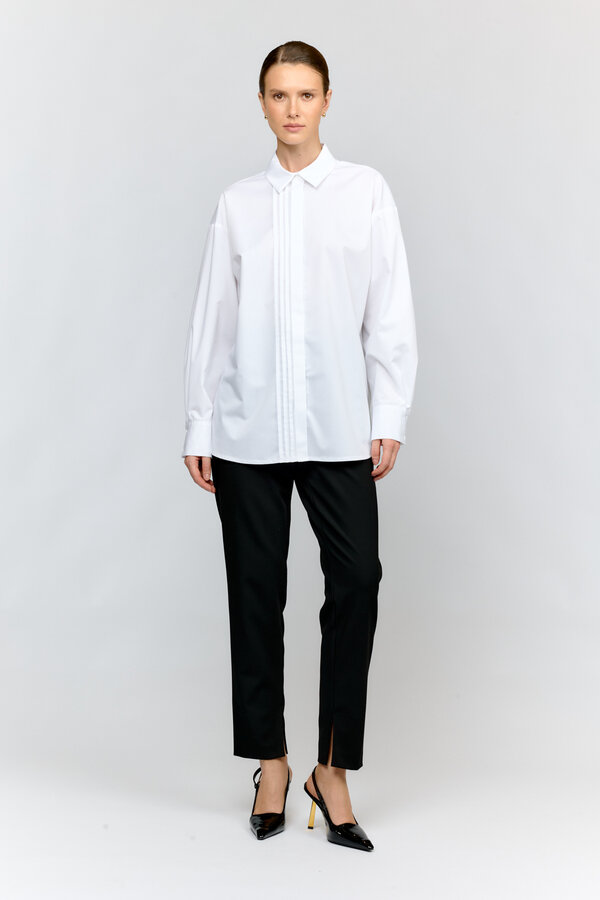 Брюки классической посадки с защипами , карманы в подрезном бочке, на задней половинке декоративная прорезная рамка. На подкладе. TREND PREMIUM QUALITY Легкая костюмная техноткань белого цвета с крэш эффектом (59% район, 35% п.э., 6% нейлон)