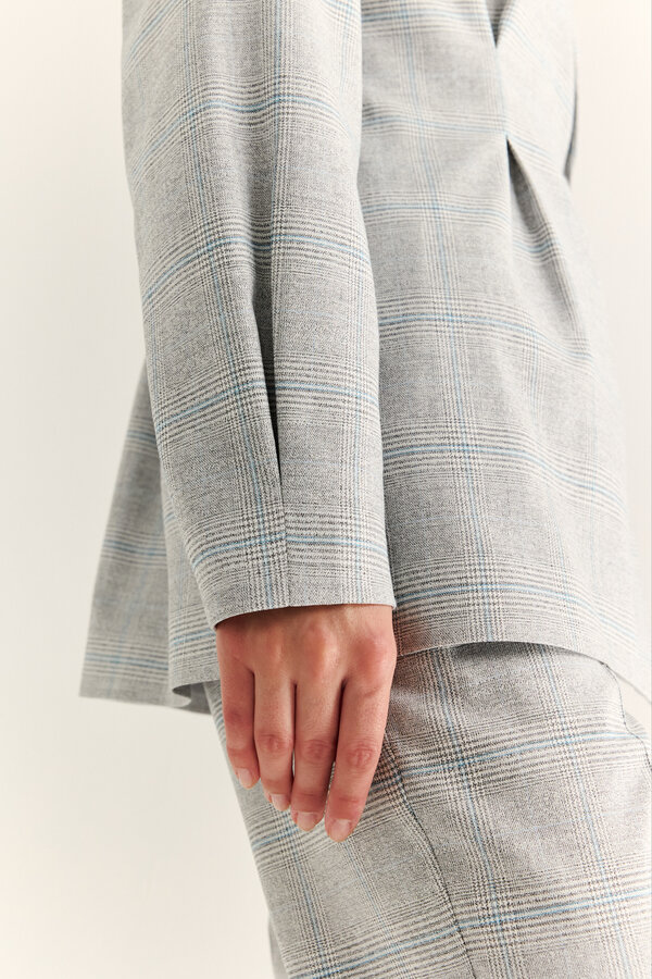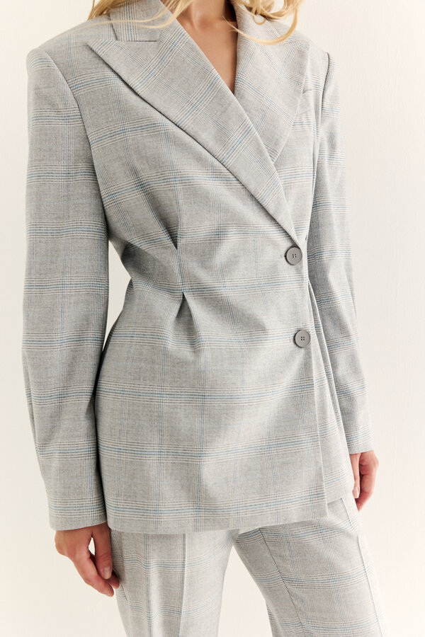 Жакет двубортный полуприлегающего силуэта длиной ниже бедер. Рукава втачные стандартной длины. С декоративной застежкой на одну пуговицу. NEW. Костюмная ткань в английскую клетку в серо-розовой гамме ( 65%п.э., 33%вискоза, 2% спандекс), размер 44, цена 3400