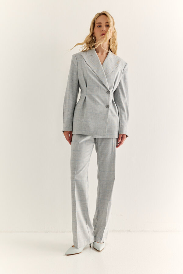 103 Брюки зауженного силуэта длиной до щиколотки. Костюмная ткань в серо-желтую клетку (64% п.э., 33% район, 3% спандекс) 2650 1000