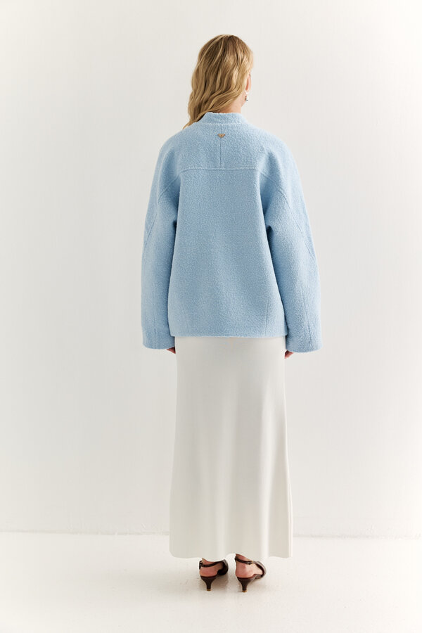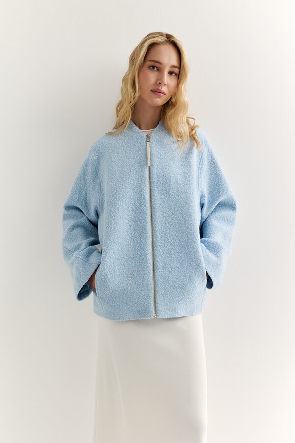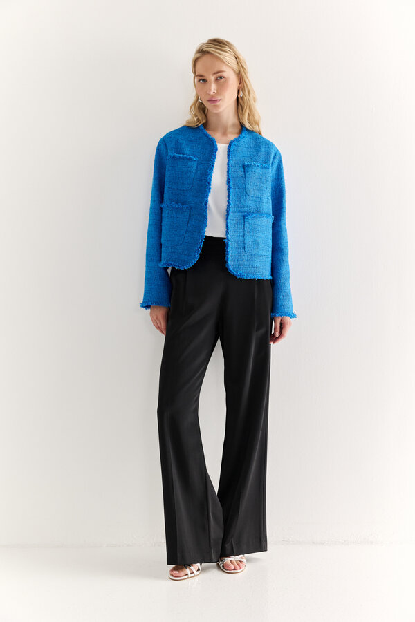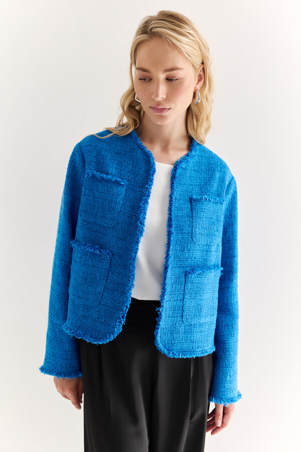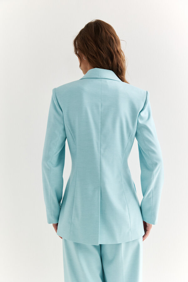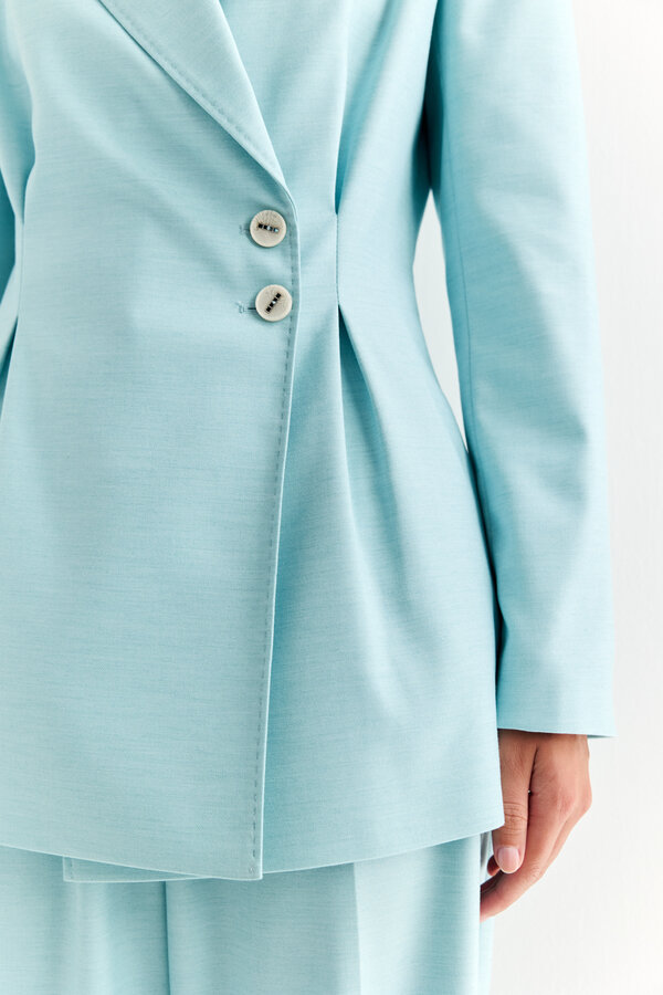 1 Жакет прямого силуэта с английским воротником с накладными карманами и декоративной отстрочкой по ней и борту.PREMIUM QUALITY/TREND COLOUR Лен костюмный в диагональную выработку с благородным блеском трендового пастельного небесно-голубого цвета (55% лен, 45% район) 3600 3000