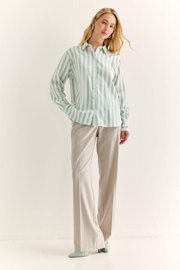101 Брюки зауженные длиной до щиколотки с разрезами по центру. PREMIUM QUALITY Костюмная ткань в невыраженную диагональ бирюзового цвета (70% терилен, 23% район, 7% спандекс) 2000 1000