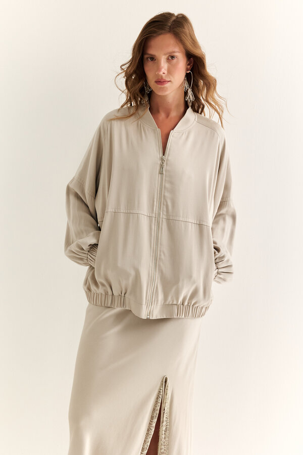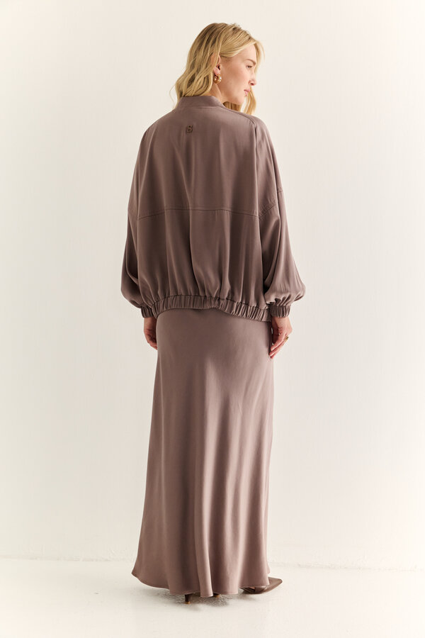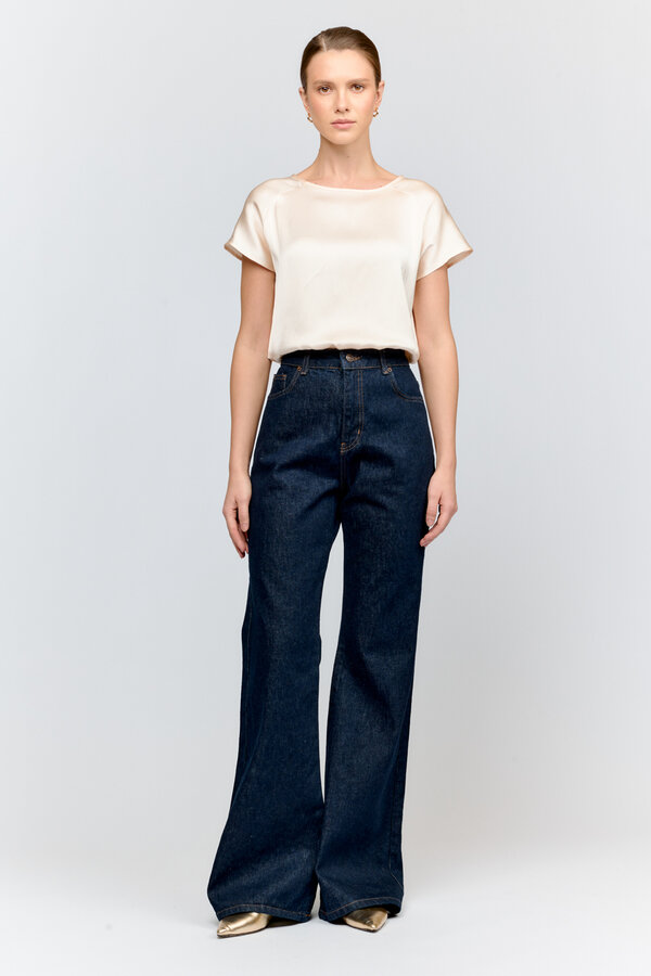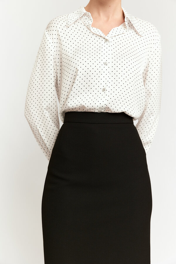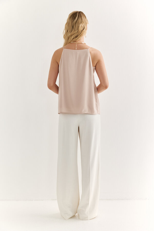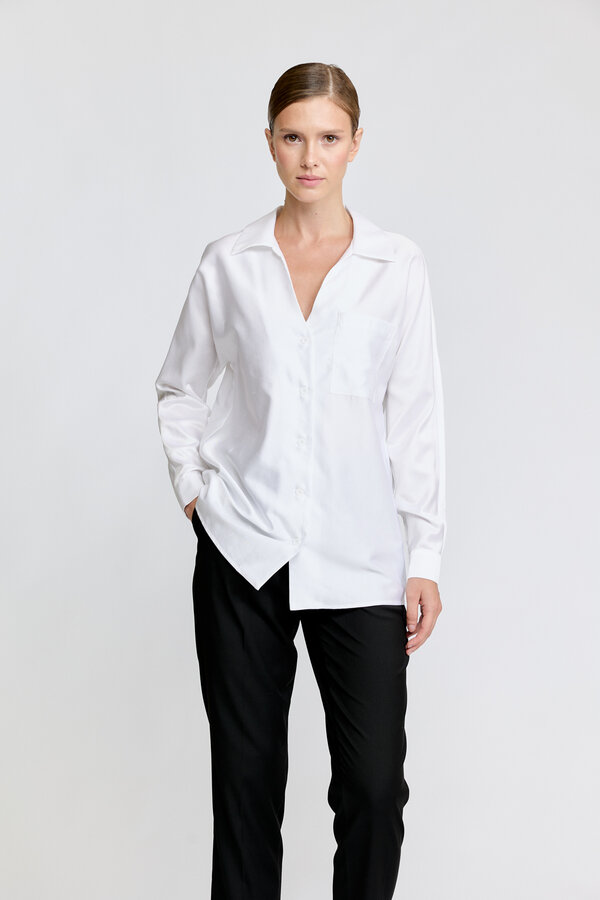95 Блуза прямого силуэта с V-образным вырезом и цельнокроеными рукавами. Струящаяся атласная вискоза молочного цвета с жемчужным переливом (48% район, 52% п.э.) 2220 1000