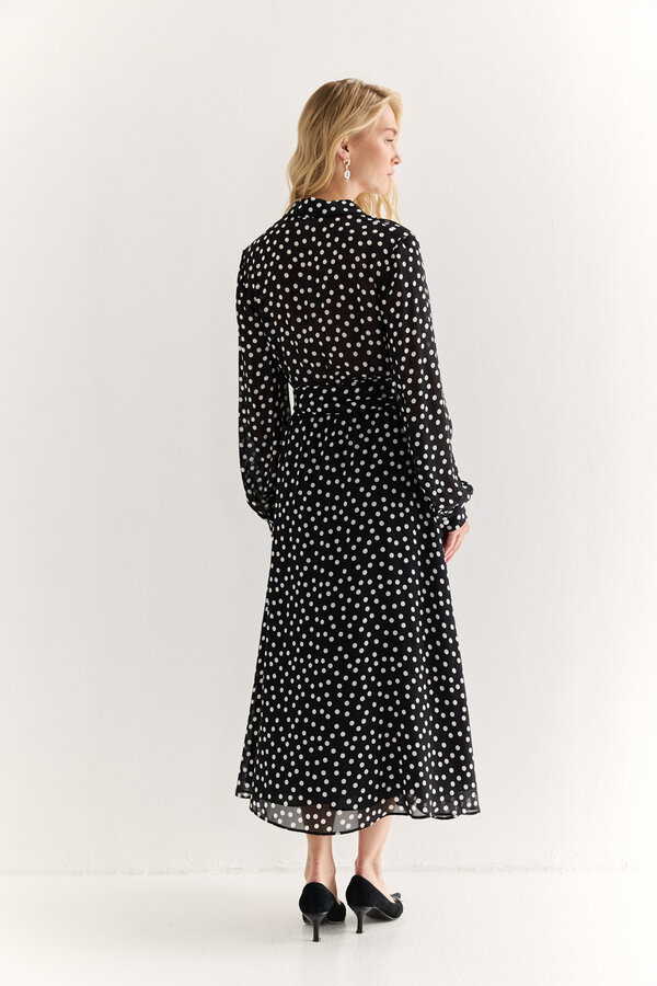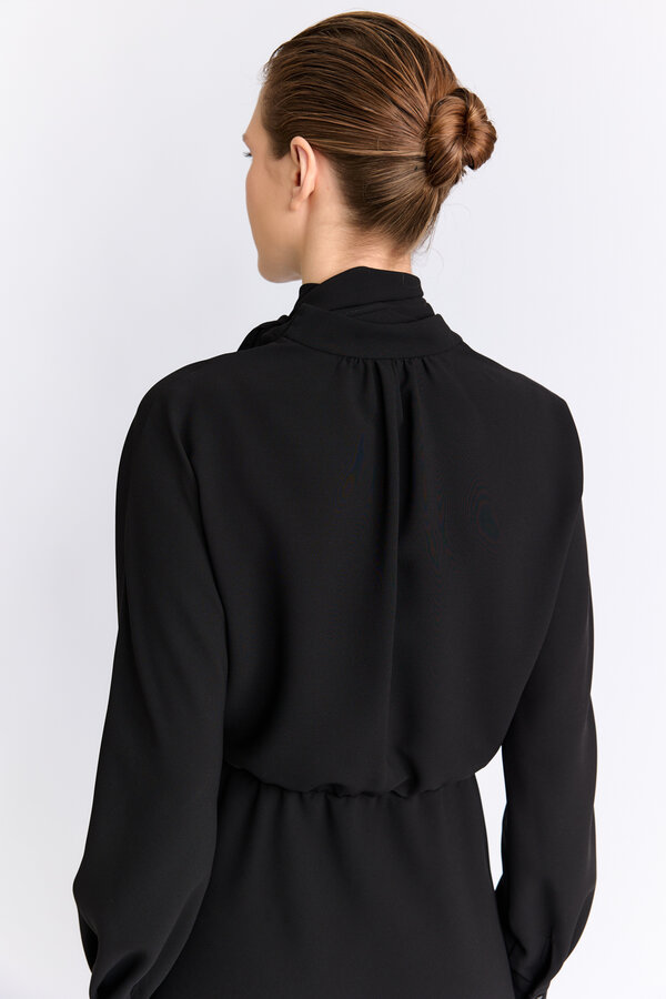 58 Платье с отрезной юбкой на запах и английским воротником. Длина миди. Плательный матовый креп черного цвета (100% полиэстер) 5300
