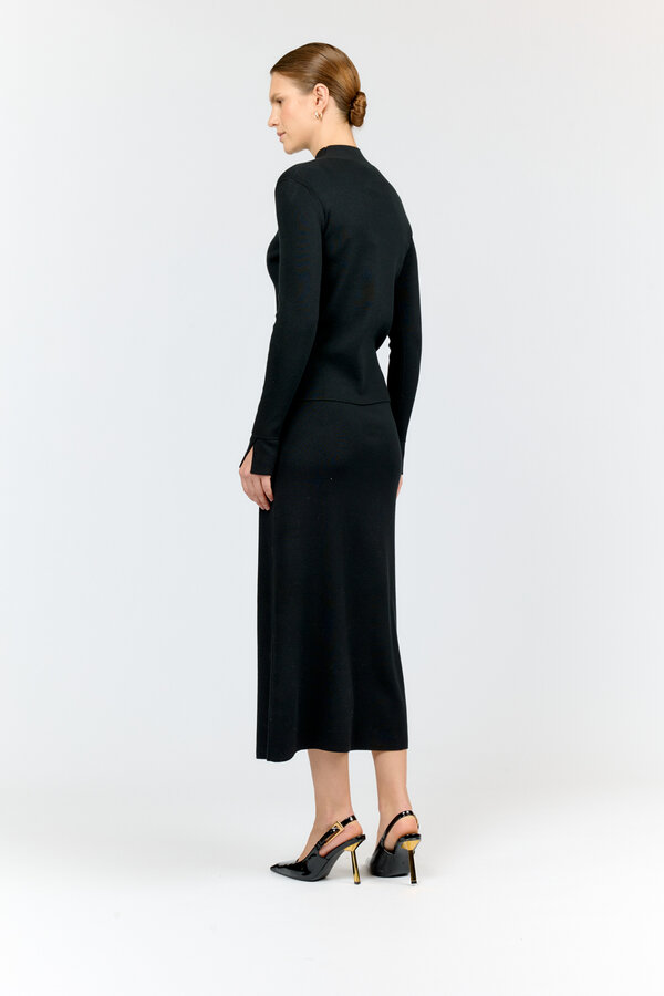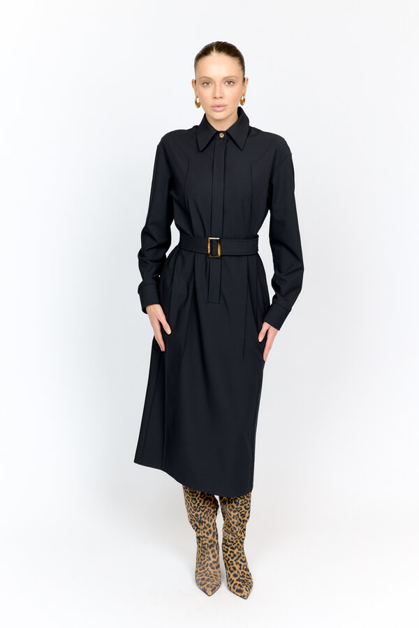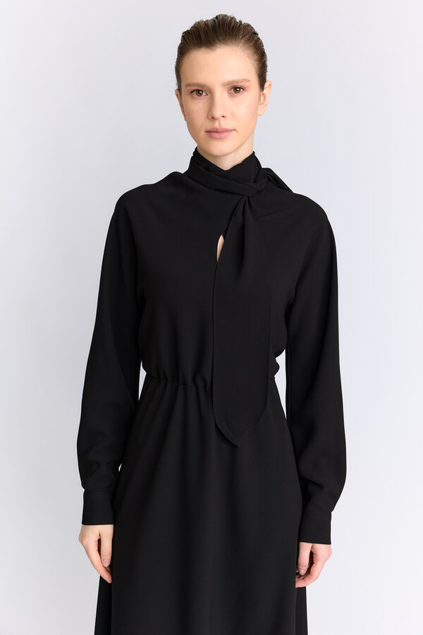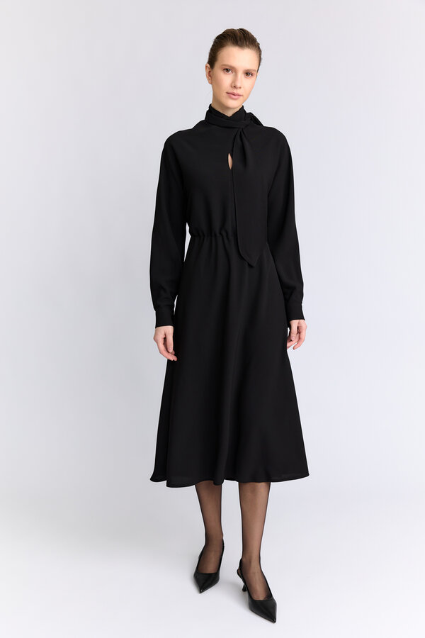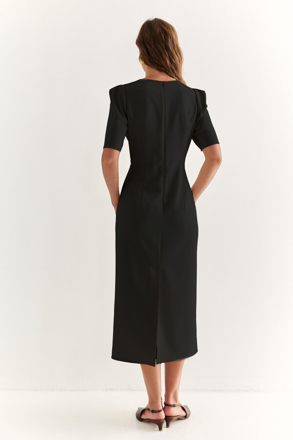 34 Полуприлегающее платье с отрезной линией талии элементом узда по ней. Рукав втачной прямой. Вырез горловины круглый. Длина до середины икр. 98 %терилен, 2% п.э. TREND NEW PREMIUM QUALITY Креп плательный черного цвета 2700 1500