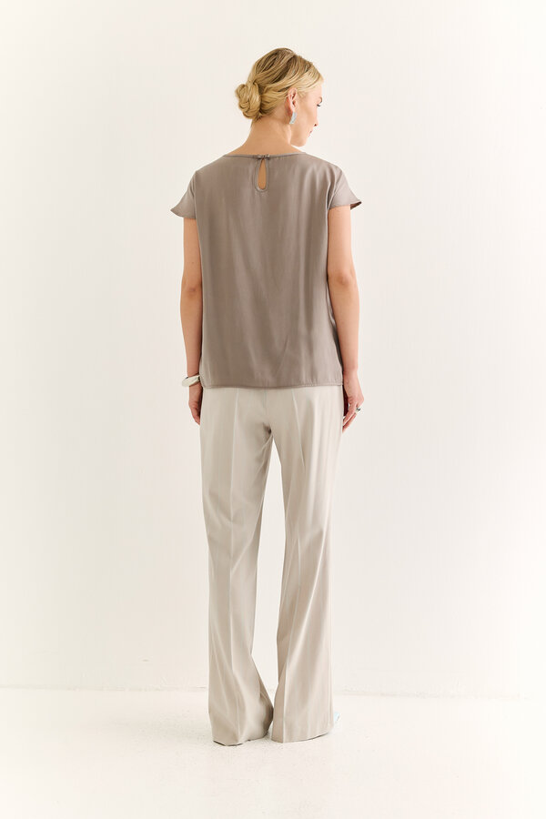 11 Топ с короткими рукавами. TREND PREMIUM QUALITY Струящаяся атласная вискоза пастельного оливкового оттенка с жемчужным переливом (50% вискоза, 50% район) 1800