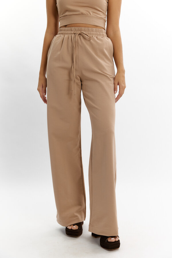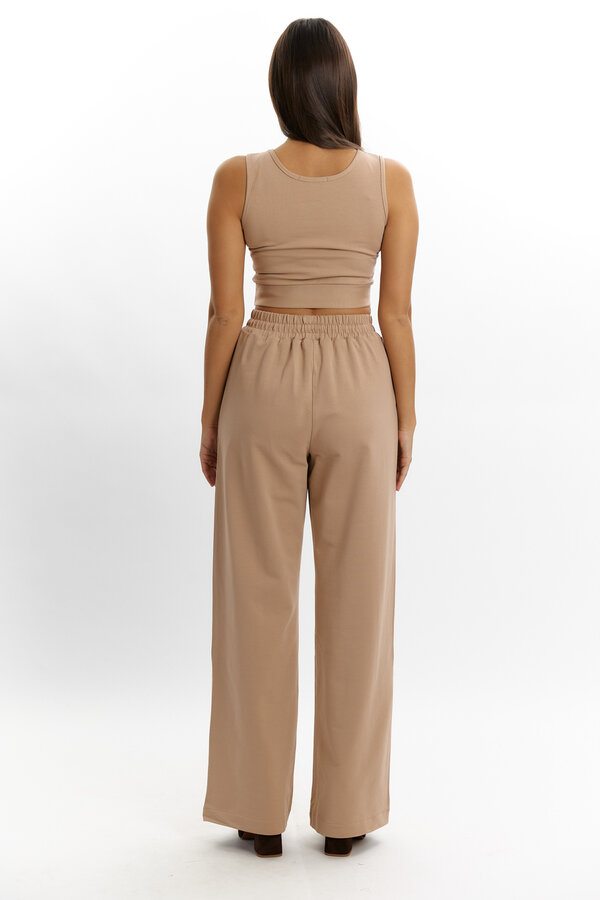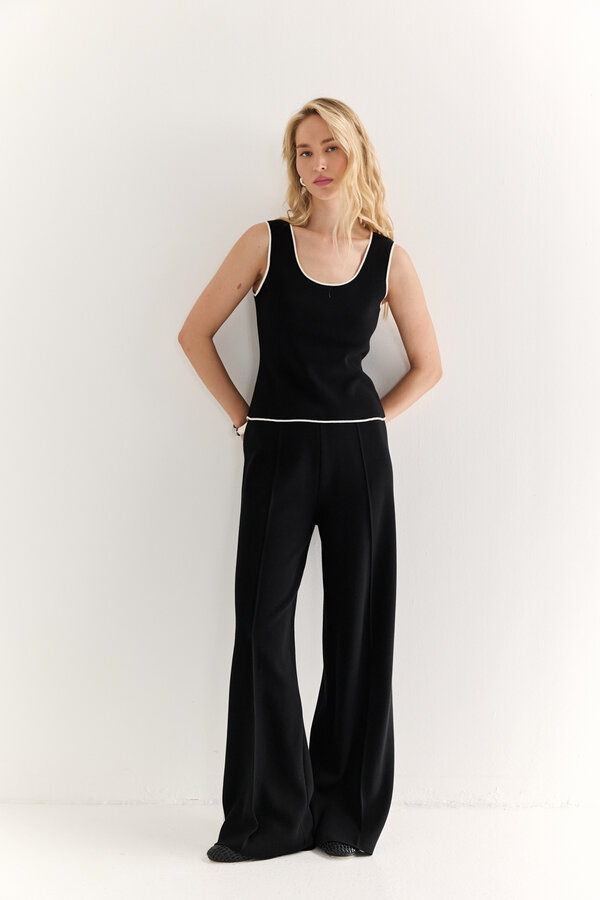 67 Брюки с небольшим клешем от колен с декоративной вшивкой по бокам.