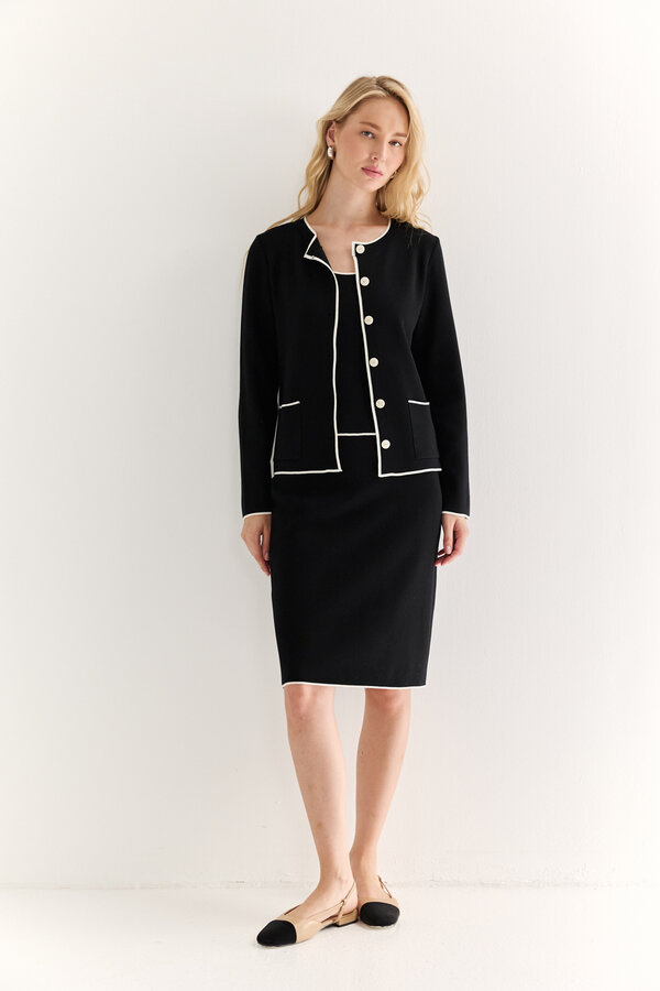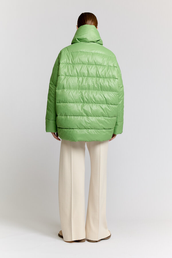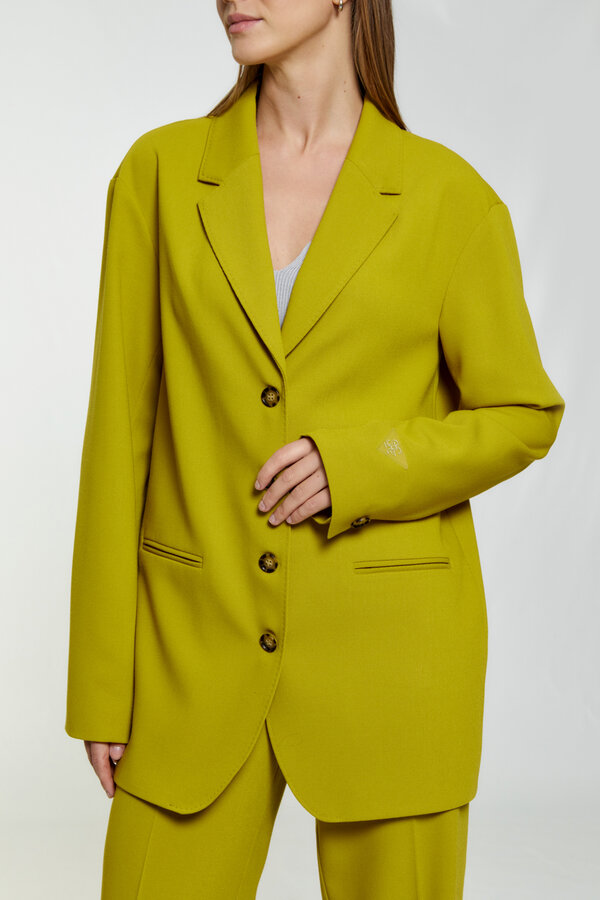 17 Укороченный жакет мягкого силуэта с круглым вырезом горловины. Борт фиксируется на кнопки, на планке декоративные пуговицы. Низ рукава оформлен манжетой на кнопку. 80% п.э., 11% вискоза, 3% тенсель, 3% шерсть, 3% спандекс NEW PREMIUM QUALITY Костюмная ткань с переплетением рогожка в невыраженную полоску неоново-лимонного цвета 4 350 руб. 3500
