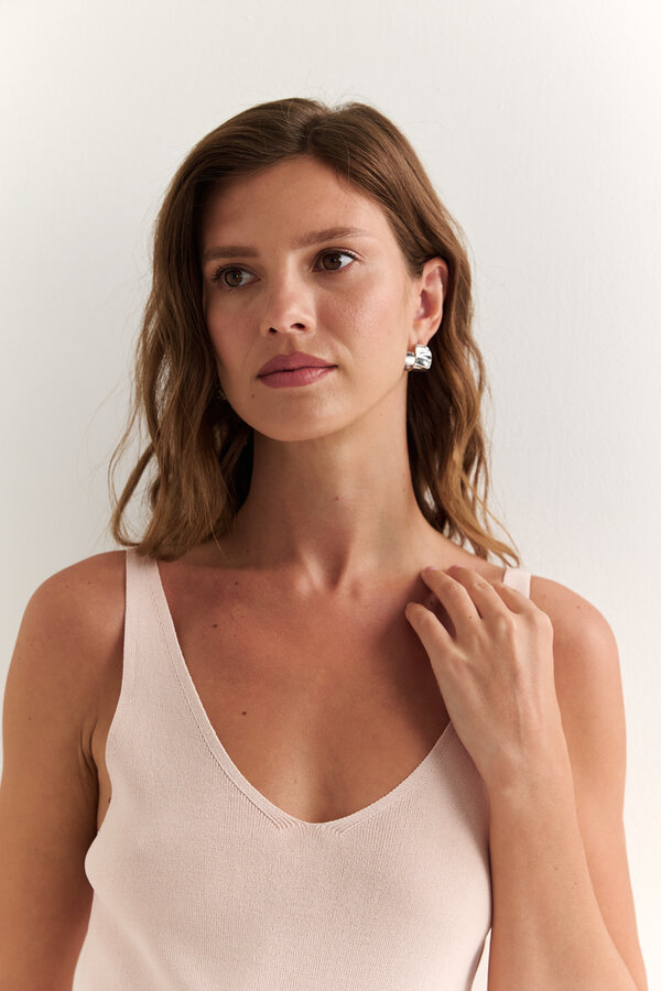 10 Топ с короткими рукавами. TREND PREMIUM QUALITY Струящаяся атласная вискоза пастельного кораллового оттенка с жемчужным переливом (50% вискоза, 50% район) 1800