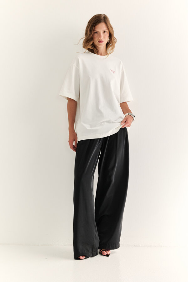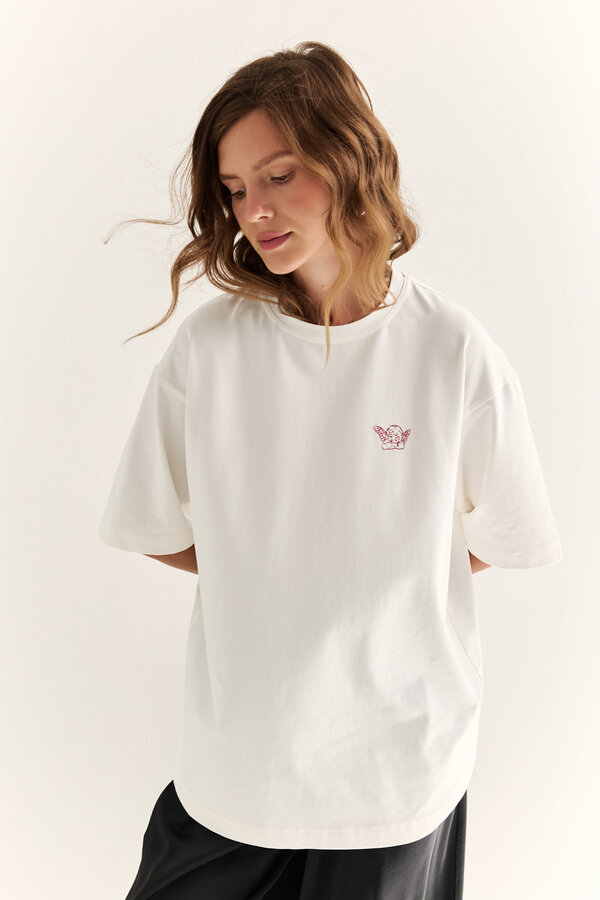 28 Футболка прямого кроя с коротким рукавом. Хлопковое трикотажное полотно кулирная гладь молочного цвета Вышивка "Очки" (95%хлопок, 5 %лайкра) 2050